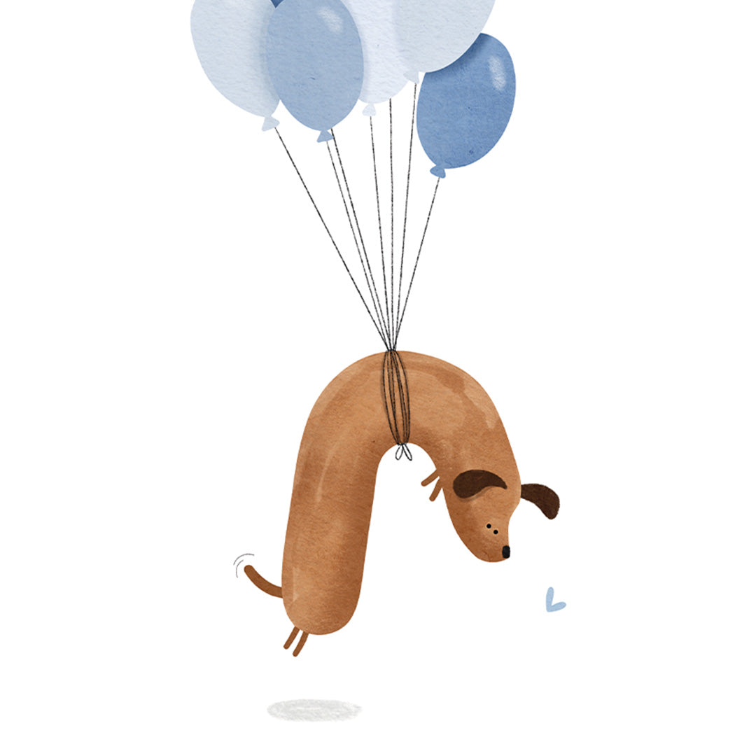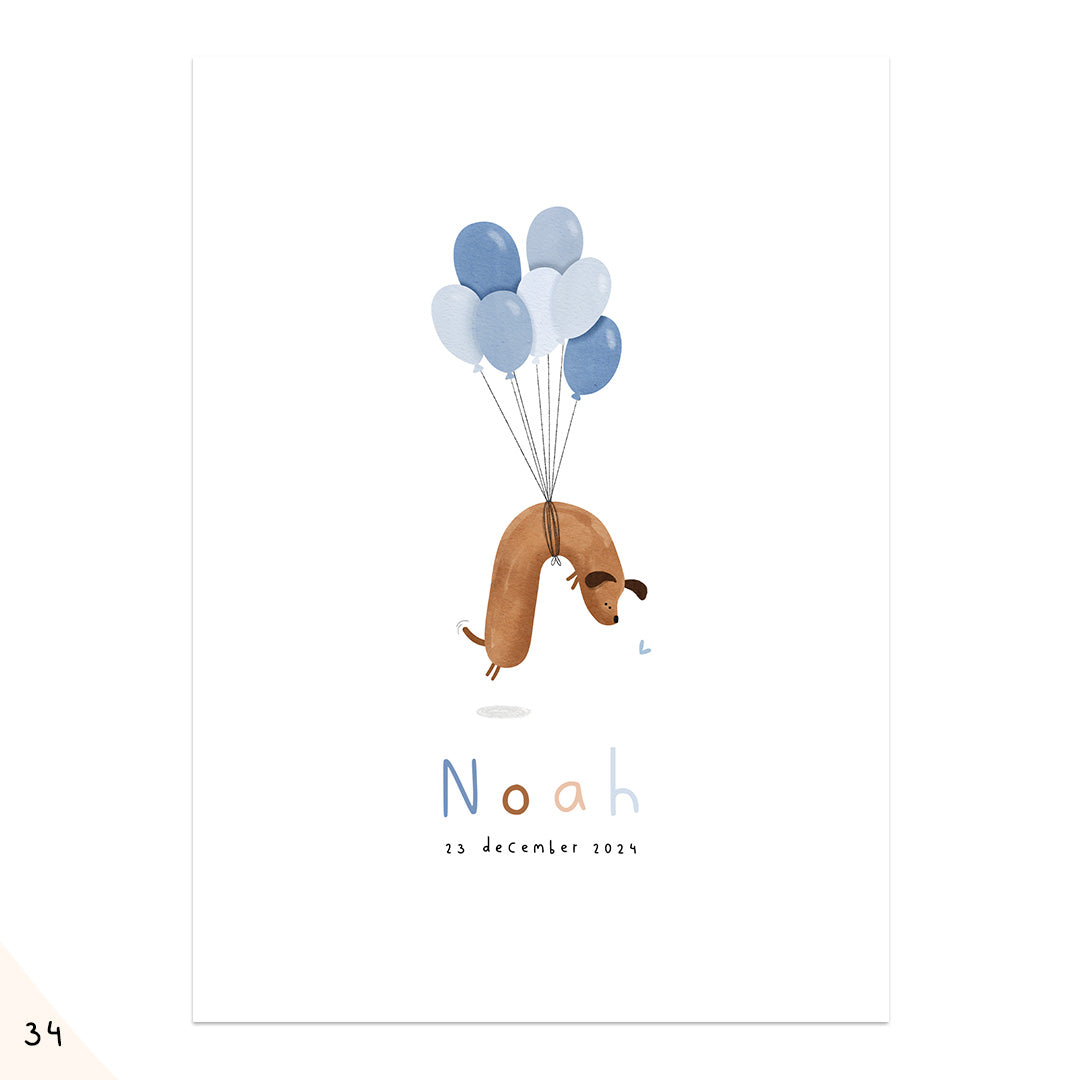 Geboortekaartje van teckeltje aan een trosje ballonnen klaar om een nieuwe baby te vieren!
