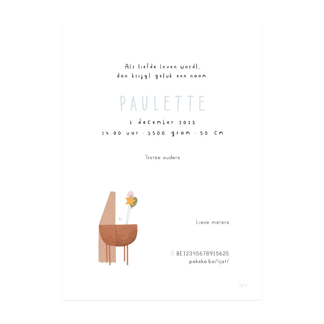 Dit kaartje heb ik gemaakt voor de geboorte van Paulette. Willen jullie ook een uniek en op maat gemaakt geboortekaartje voor deze bijzondere gebeurtenis?