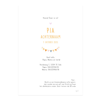 Dit kaartje heb ik gemaakt voor de geboorte van Pia. Willen jullie ook een uniek en op maat gemaakt geboortekaartje voor deze bijzondere gebeurtenis?