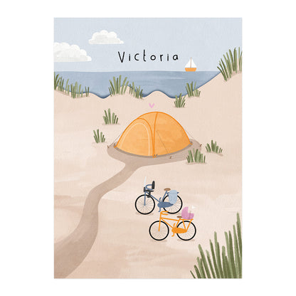 Lief geboortekaartje van een tentje in de duinen en vrolijke fietsjes met wiegje!