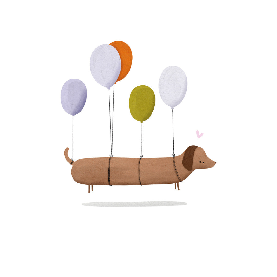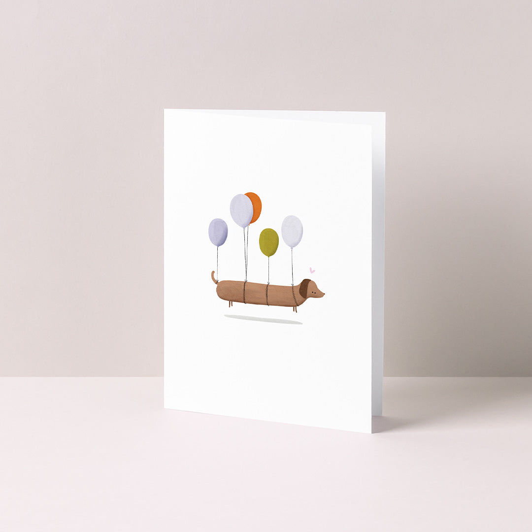 Er valt altijd wel iets te vieren en daar weet deze teckel met zijn ballonnen alles van. Heeft de oude buurvrouw haar scooterrijbewijs gehaald? Je nichtje haar veterstrikdiploma gekregen? De hond van de burgemeester een trucje geleerd? Alle reden voor een felicitatiekaart!