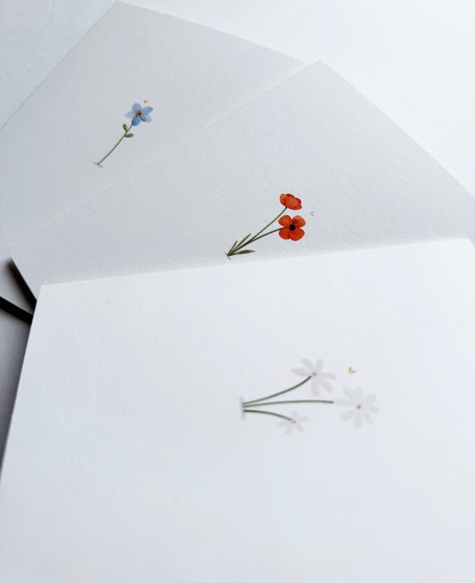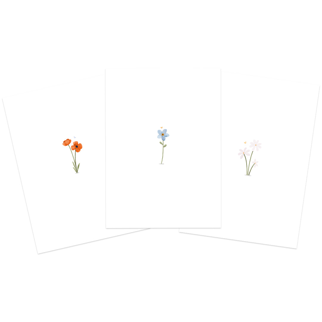 Setje van drie troostkaarten: madeliefjes, vergeet-me-nietje en klaprozen!