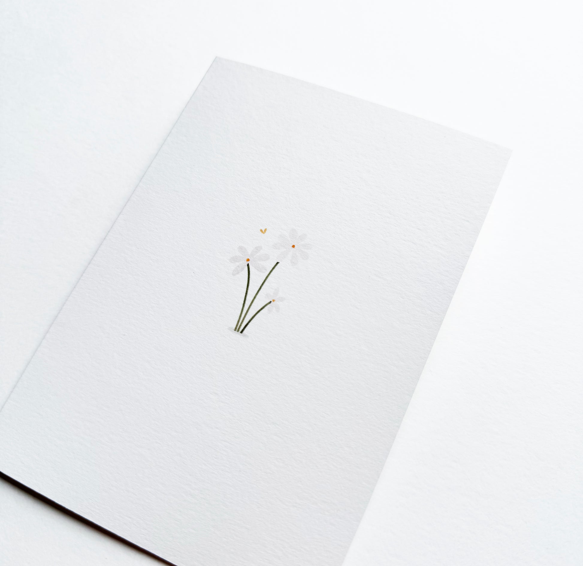 De kaart is gedrukt op prachtig off-white papier met lichte textuur, is leeg aan de binnenzijde en komt met een licht grijze envelop.